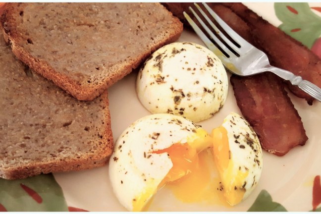 I learned this method of preparing poached eggs from my dad. He had the timing down just right for firm whites with runny yolks, perfect for dipping pieces of toast (my sourdough bread makes excellent toast!) or bacon in. I’m not sure whose idea it was to season them with herbs, but it was something we always did. You really need to do it, too.