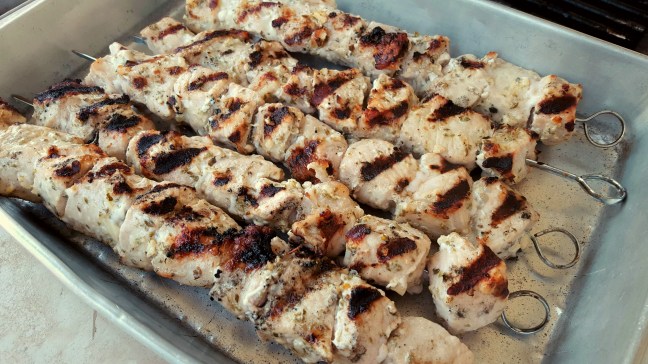 I use a gas barbeque grill for my souvlaki, but you could use any kind grill, or the broiler of your oven. For the grill, turn the heat to high while the grill is closed to preheat it. Once the grill is very hot, place each skewer directly on the racks, spread out so that they are not touching each other. Turn the gas to low, and cover the grill. Cook for about four minutes, then uncover and turn each skewer over. Cover again and cook for about 3-4 minutes more. Be aware of cooler spots that may need more cooking time. Check your meat by squeezing it with some tongs. It should be only a little squishy, but don’t let it get too firm or it will be over done and dry.