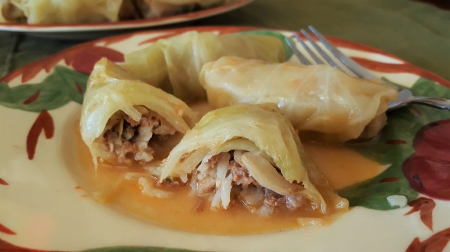 This particular version uses tomatoes, which is not the most common, but gives a nice tangy taste. It also uses some of the cabbage that can’t be used in the rolls themselves. So they are extra cabbag-y! Since the cabbage is added, no onions are used. Yay! No tears!