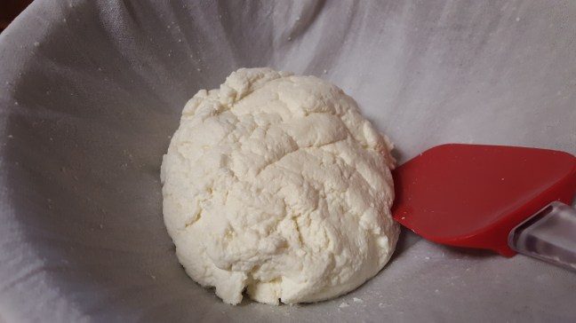 Line a strainer or colander with a clean tea towel or muslin cloth, and set it over a large bowl. Carefully pour the liquid from the pot into the strainer to filter out the whey. Use a spatula to scrape the milk solids from the sides of the cloth to keep the liquid moving through. Once all the liquid has drained through, if you want your cheese salted, which it will need to be if you want to dry it, you will add it now and gently mix it into the cheese curds. The whey you strain out can be used to make more cheese (following the traditional method), or used as a great soil-acidifier for acid loving plants like blueberries, hydrangeas, gardenias, etc., so don’t just dump it! Even other plants will appreciate the nutrient boost. Just be sure to let it cool first!