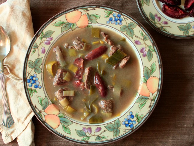 In this version, browned stew meat and rich, beef broth are used along with the leeks as well as a little garlic. There’s still the ground black pepper and plums added, so you get the same richness and unique flavor combination, but with a little more heartiness. It’s also perfect for multi-season enjoyment: warming enough for a winter’s meal, but light enough for when the weather heats up!