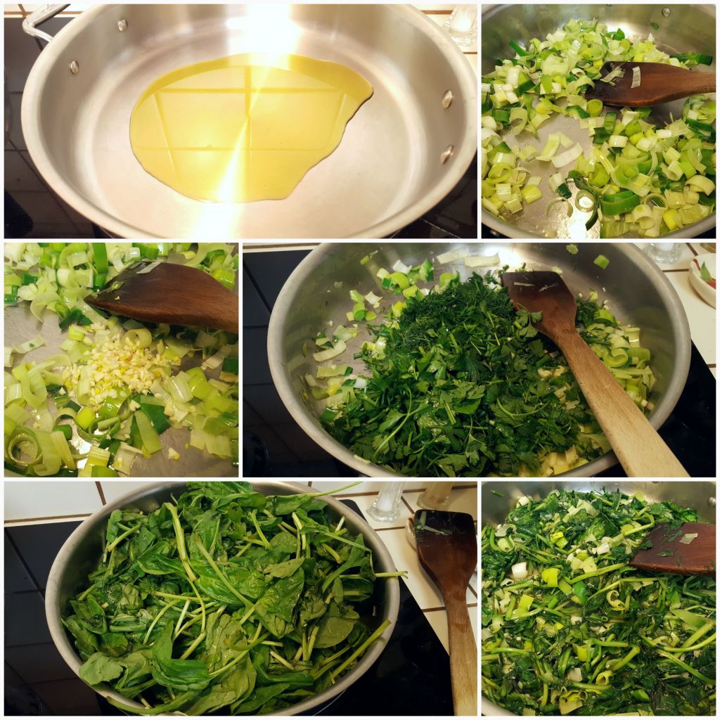 Add in the dill and parsley and stir to completely combine and reduce the heat to medium-low. Add the spinach in stages so as not to overfill the pan all at once. Cover the pan for a few moments each time to let the steam begin to wilt the spinach, then uncover and gently stir it in. Continue to do this until all the spinach has been added and wilted. Be careful not to let the bottom scorch.