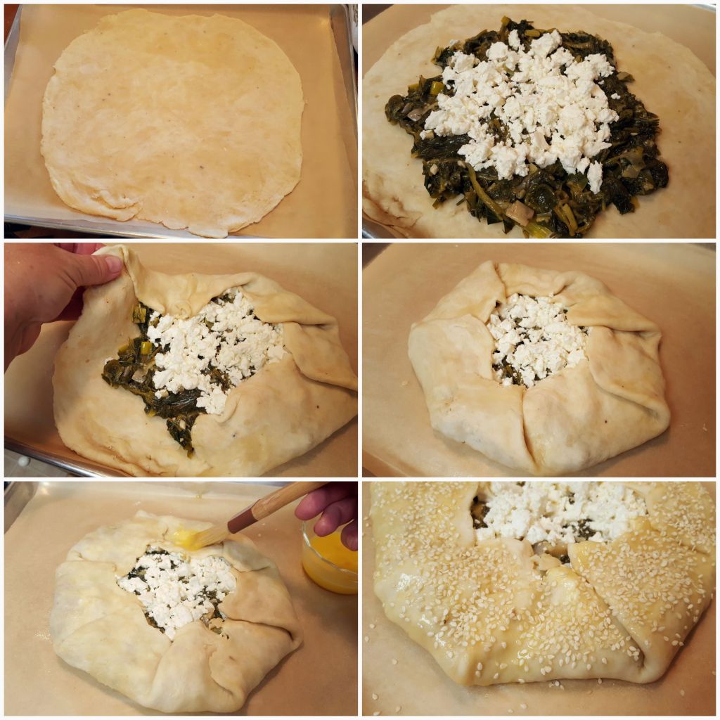 Divide the filling in half and put into the center of the dough. Spread out to within two inches of the edge. Sprinkle half of the feta over the filling. Lift a section of the edge of the dough up and over the filling. Then lift the next section up and over. Repeat until the dough is folded over all around while leaving a wide hole in the center. Brush the top of the dough with the egg and then sprinkle sesame seeds all over the dough. Any leftover egg can be drizzled over the surface of the filling, if desired, or cooked for a quick bite!