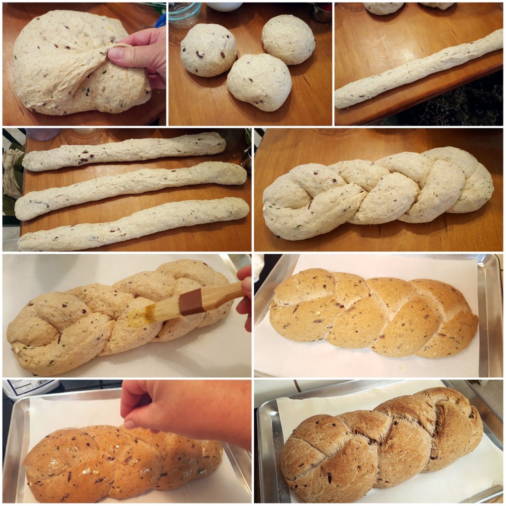 Allow the dough to sit for 20 minutes, then knead a few more minutes. Divide the dough into three equal sized pieces. Form long, equal length ropes from each one (about 18 inches long) and braid them together. See my post for making tsoureki (Greek Easter bread) for a video on how to braid the loaf. Place the braid on a parchment paper lined baking tray.