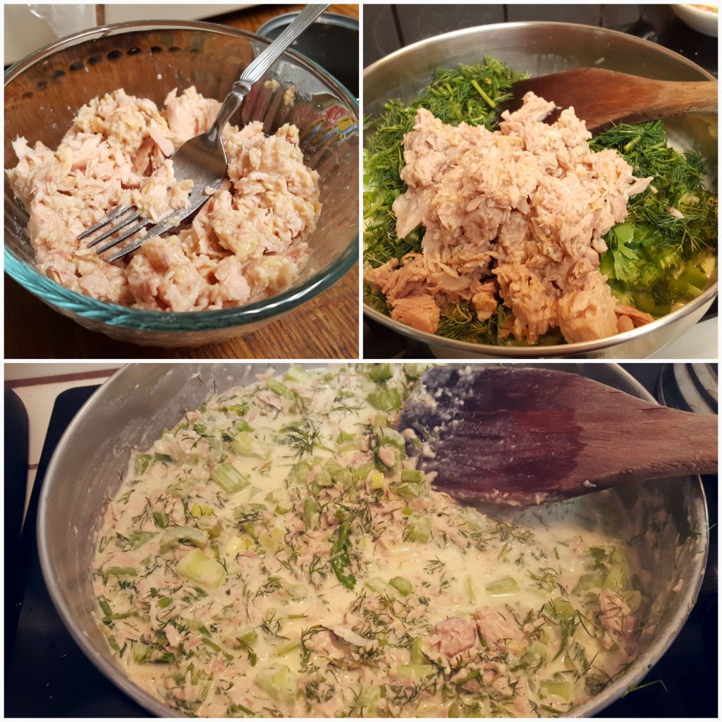 Add all the remaining ingredients, including the remaining 1/2 cup of cream. Be sure to break up the tuna/salmon/chicken into fine pieces before adding. Bring the heat back up and stir to combine everything and to keep from scorching on the bottom. You want to cook until everything is heated through, the celery is just starting to soften, and the sauce is thickening some. Turn the heat off and leave uncovered, but the pan can stay on the burner. Allow the sauce to sit for just a few minutes to thicken more.