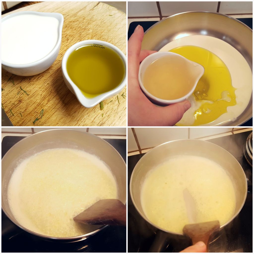 In a large pan, put 1/2 cup of the heavy cream, olive oil, and white wine. Bring to a boil, then drop to medium heat. Push the liquid around to prevent scorching and continue to cook until the sauce is thickened enough that a trail will remain for a moment after you drag a spatula through it. This should only take a few minutes to get to this point.
