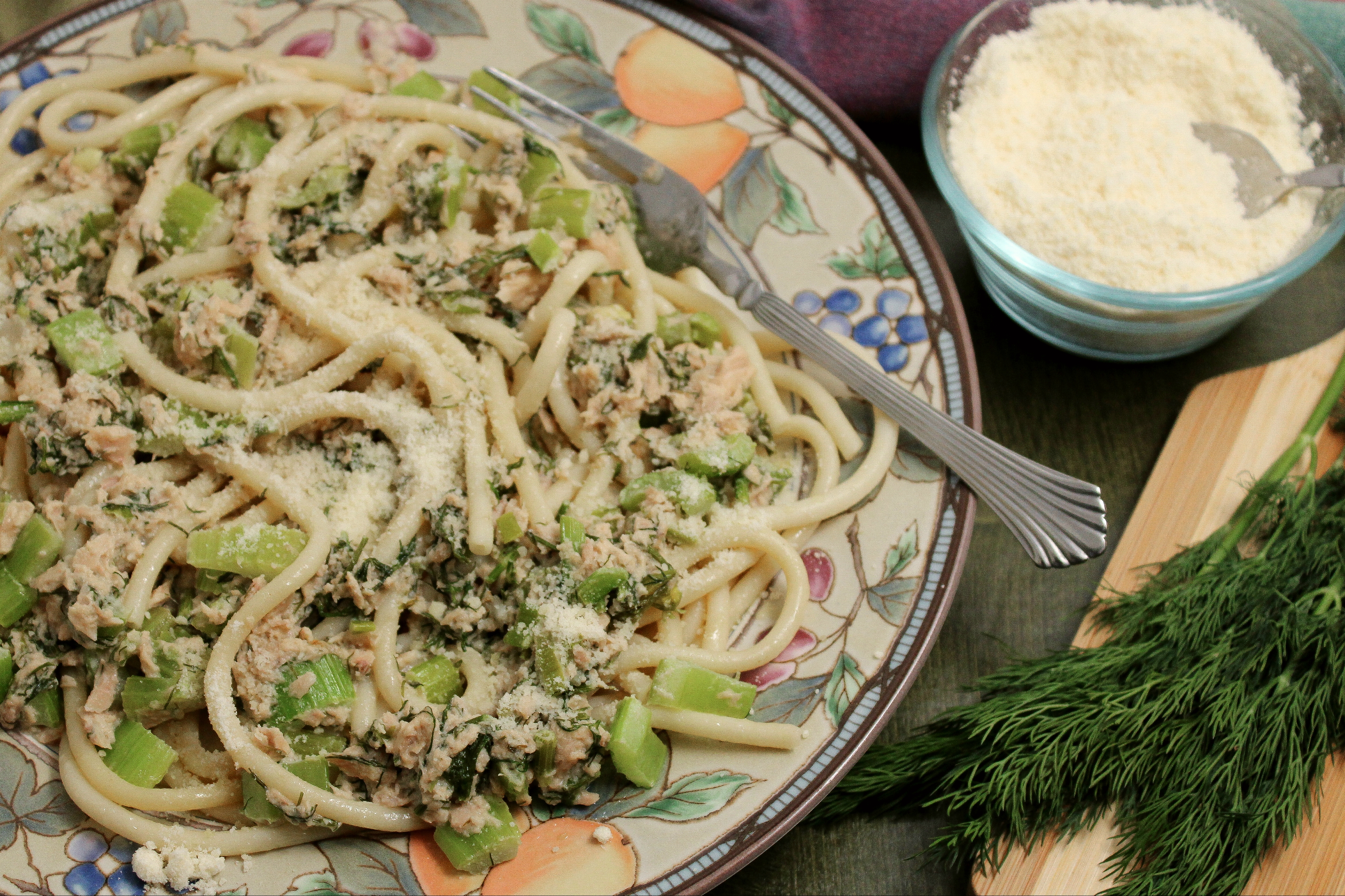 Be sure to break your tuna/salmon/chicken apart into small flakes. This allows for a smoother pasta which will be easier to serve and have a more uniform flavor in every bite.