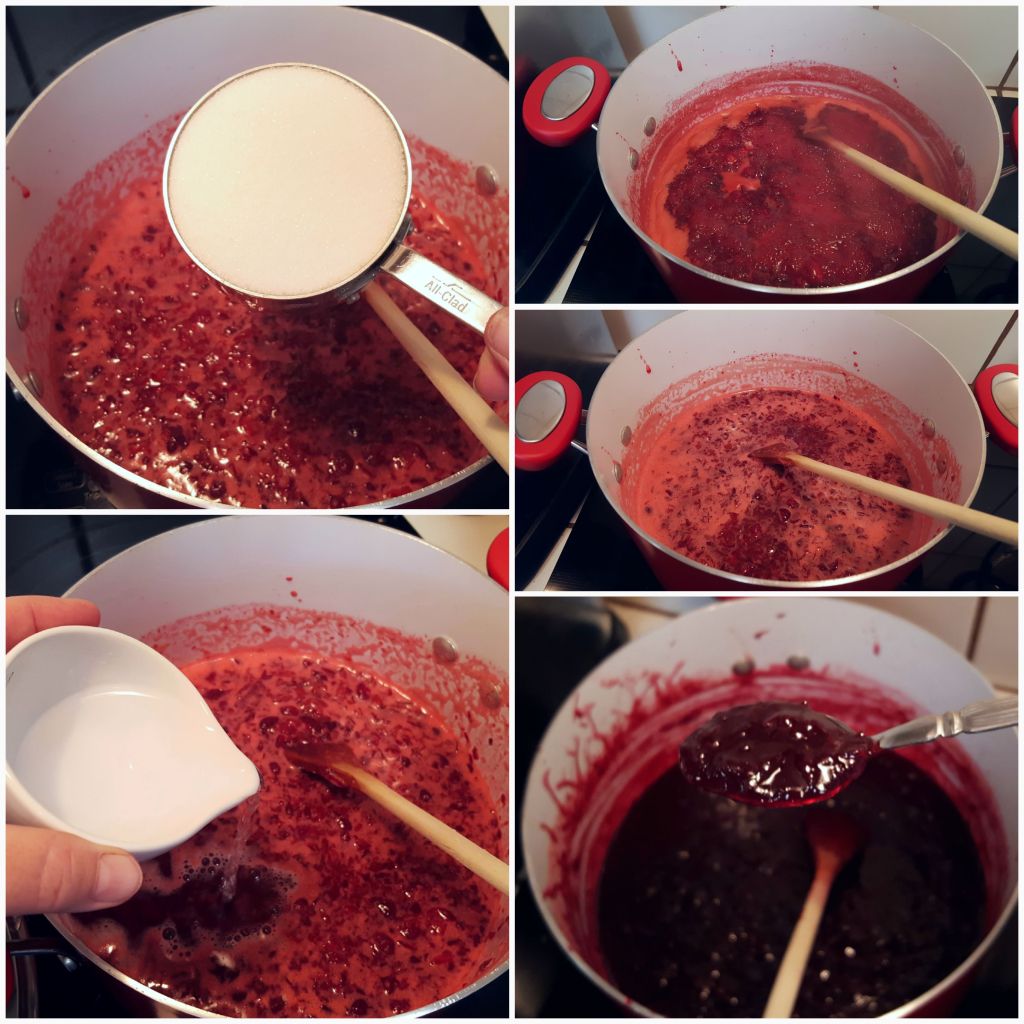 Despite the high amount of pectin in these fruits, you will prepare this jam using the “cook down” method, rather than by temperature set. This is actually an easier process and allows you to decide when you have your desired thickness. You could leave it thin to be more of a syrup, or thicker like a typical jam.