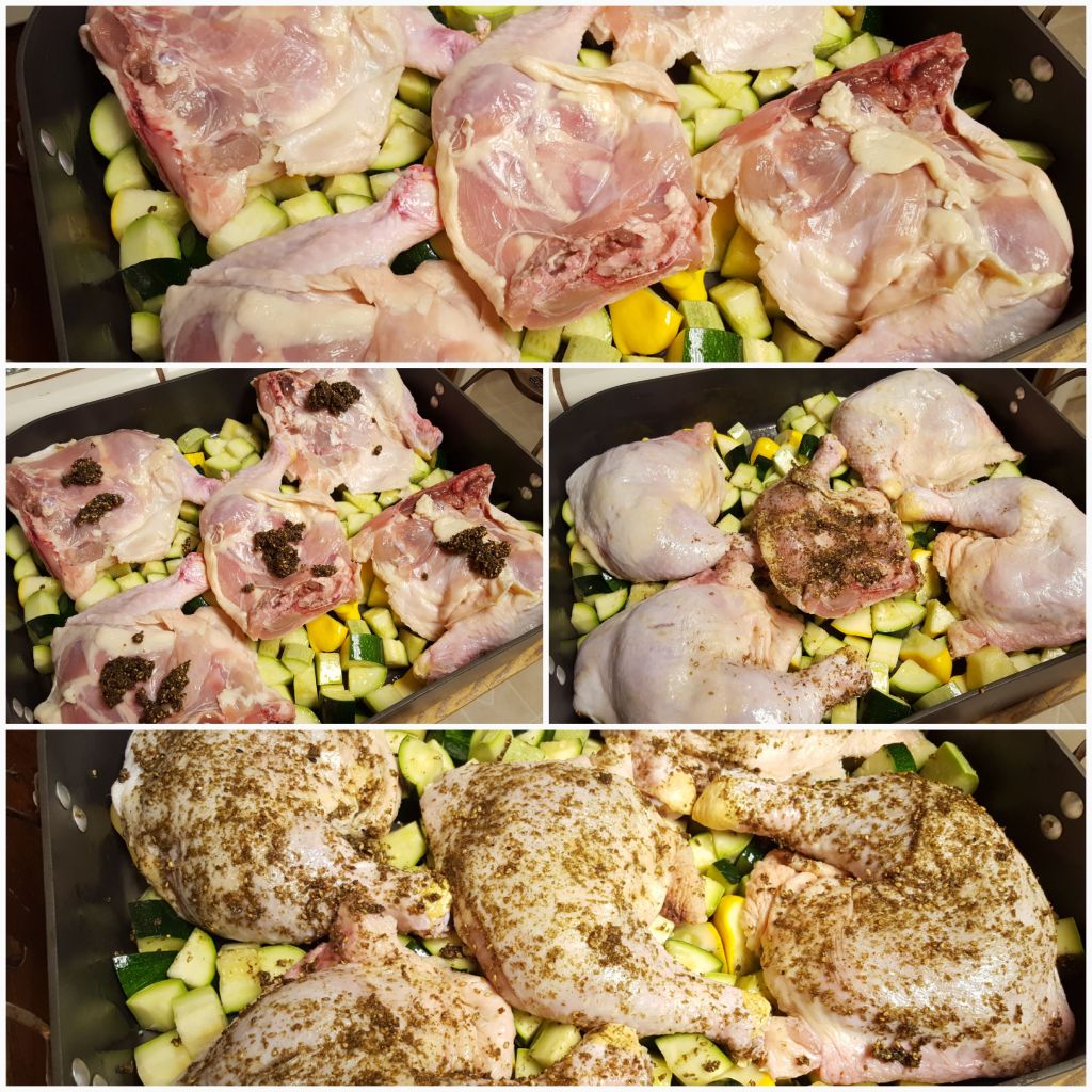 In a small bowl, put more of your seasonings, salt and pepper, and enough olive oil to make a paste. Smear it all over your chicken. You probably don’t want to be stingy, but don’t go crazy. If you made too much of the seasoning paste, you can either toss it in with the squashes or put it away in the freezer for later use (just be mindful if any of it come into contact with the raw chicken, including through your hands or a utensil).