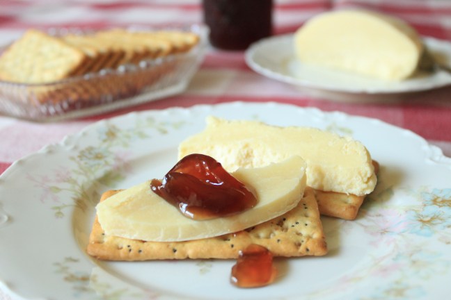 I keep my caramelized whey refrigerated, but it has a better texture that’s easier to cut and spread if it is allowed to come to room temperature. I find it best to enjoy it the way the Norwegians do, by putting it onto crackers or bread with a tasty jam or jelly. My understanding is that raspberry jam is commonly used, but I had some of my pomegranate jelly on hand and it was scrumptious! Enjoy!