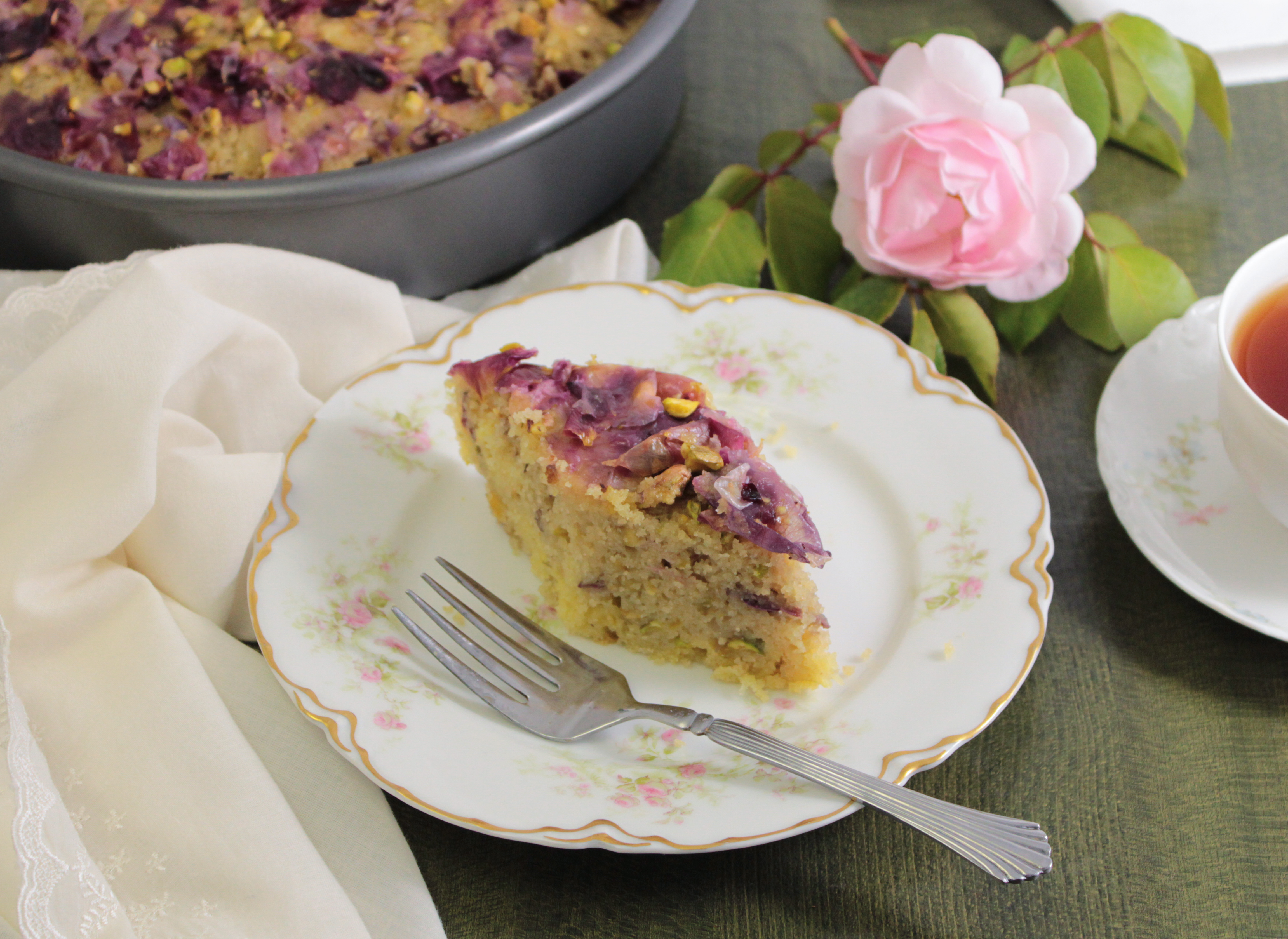 Immediately begin gently ladling half of the syrup with the rose petals evenly over the surface of the cake. Sprinkle the top evenly with the remaining crushed pistachios, then ladle the rest of the syrup with petals over. Doing it this way allows the pistachios to be held in place by the syrup, but keeps them from being buried under the petals. Gently distribute the rose petals as needed/desired.