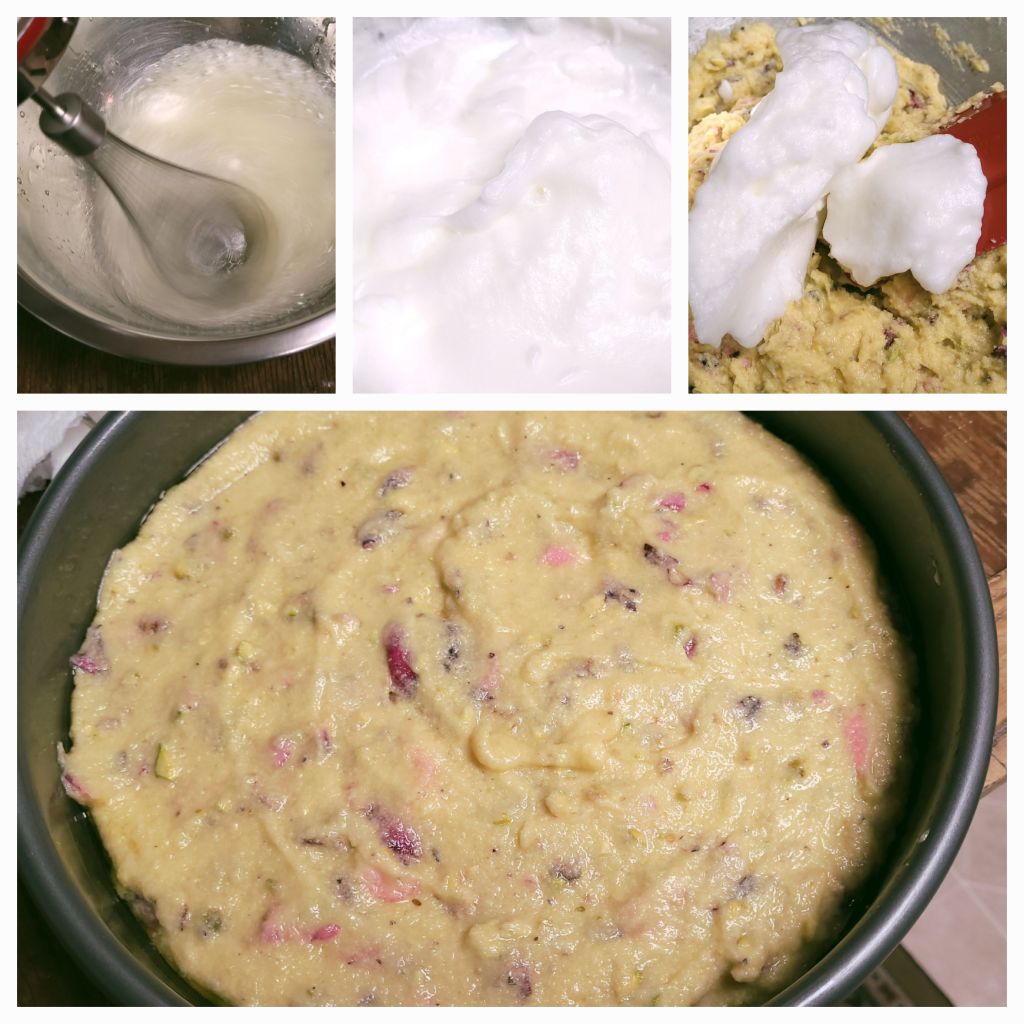 Whisk the egg whites until they are just beginning to be stiff. You should be able to make a peak with the foam that just holds its shape, and the whites should be a little glossy. Very gently fold the egg whites a third at a time into the batter. You will add each amount before the previous one has been completely mixed in. Once all the whites have been added you will continue to fold gently until it is fully incorporated. You want to do this very gently so that you don’t completely deflate all the bubbles in the egg whites as this is where a lot of your cake’s rise will come from. Don’t use a mixer!!