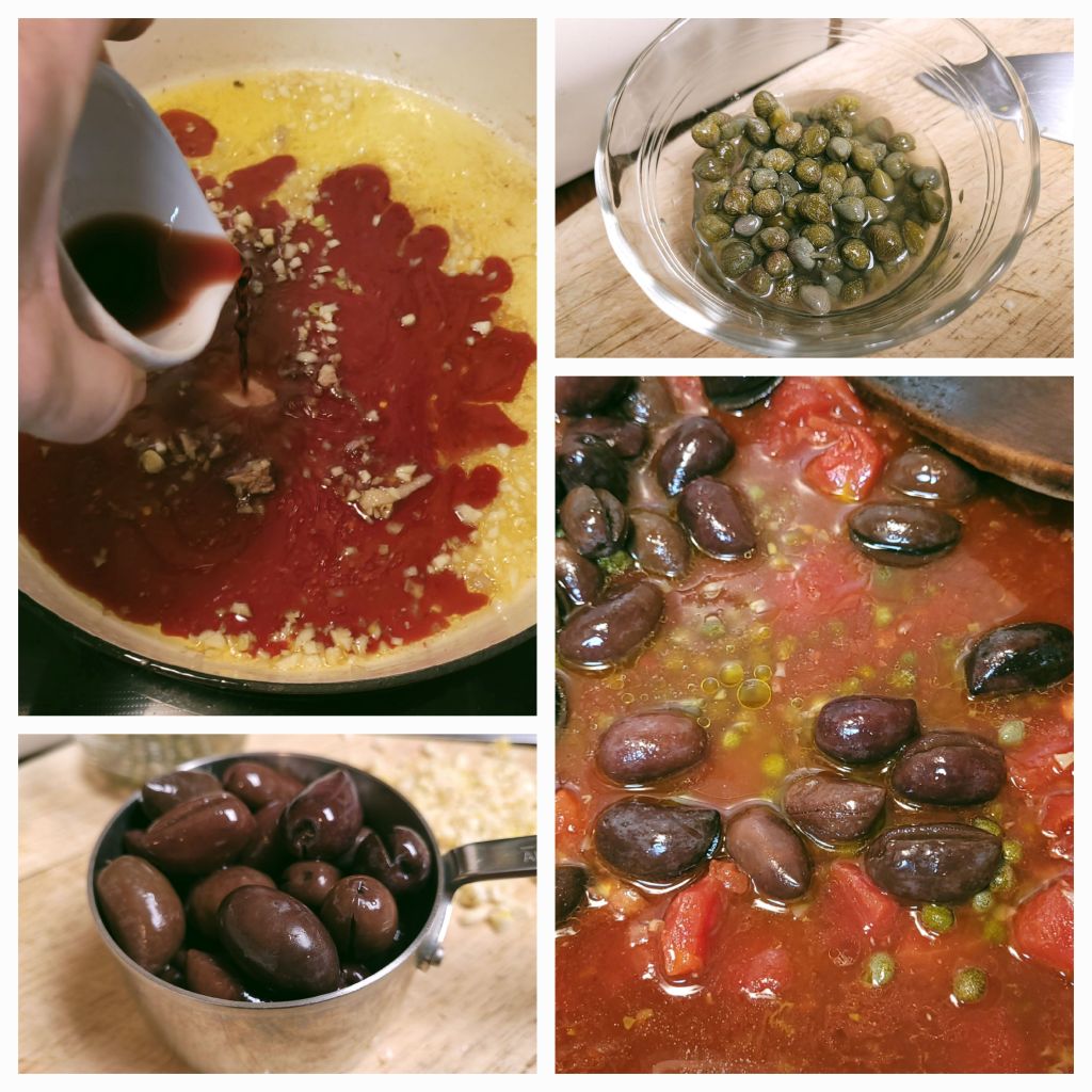 My inspiration for this recipe came from another similarly prepared Greek dish called stifado, which is a stew of chicken and pearl onions that are slowly simmered in a seasoned bath of tomatoes and sauce. In this case, the onions are replaced by flavorful Kalamata olives and pickled capers, both of which add texture as well as taste. There’s still an aromatic bath of tomatoes, but with some slight changes to the seasonings used.