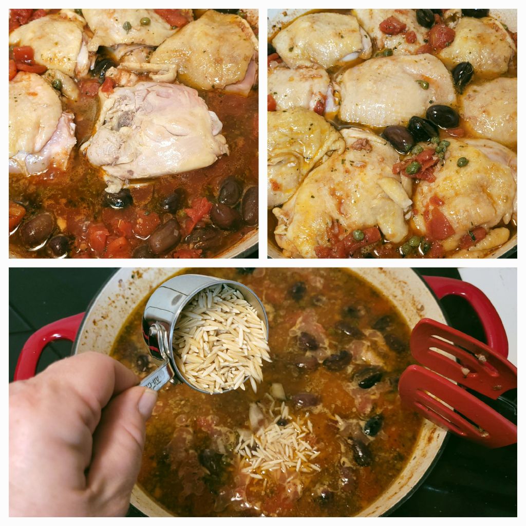- You could cook the kritharaki pasta in the sauce after removing the chicken (which could be crisped up or just kept warm while the pasta cooks). To cook the pasta, add the pasta to the sauce in the pan and combine. Cook on low heat, covered, stirring every few minutes. If the pasta sticks (and it likely will), remove it from the heat and let sit for a minute then push the pasta off the bottom of the pan with a spatula before returning to the heat. Add water 1/4 cup at a time as needed until the pasta is cooked to your preference. This may take up to 15 minutes. I like to let the pasta sit covered and off the heat for an additional 5 minutes to help absorb more liquid. Serve alongside the chicken topped with grated cheese like parmesan.