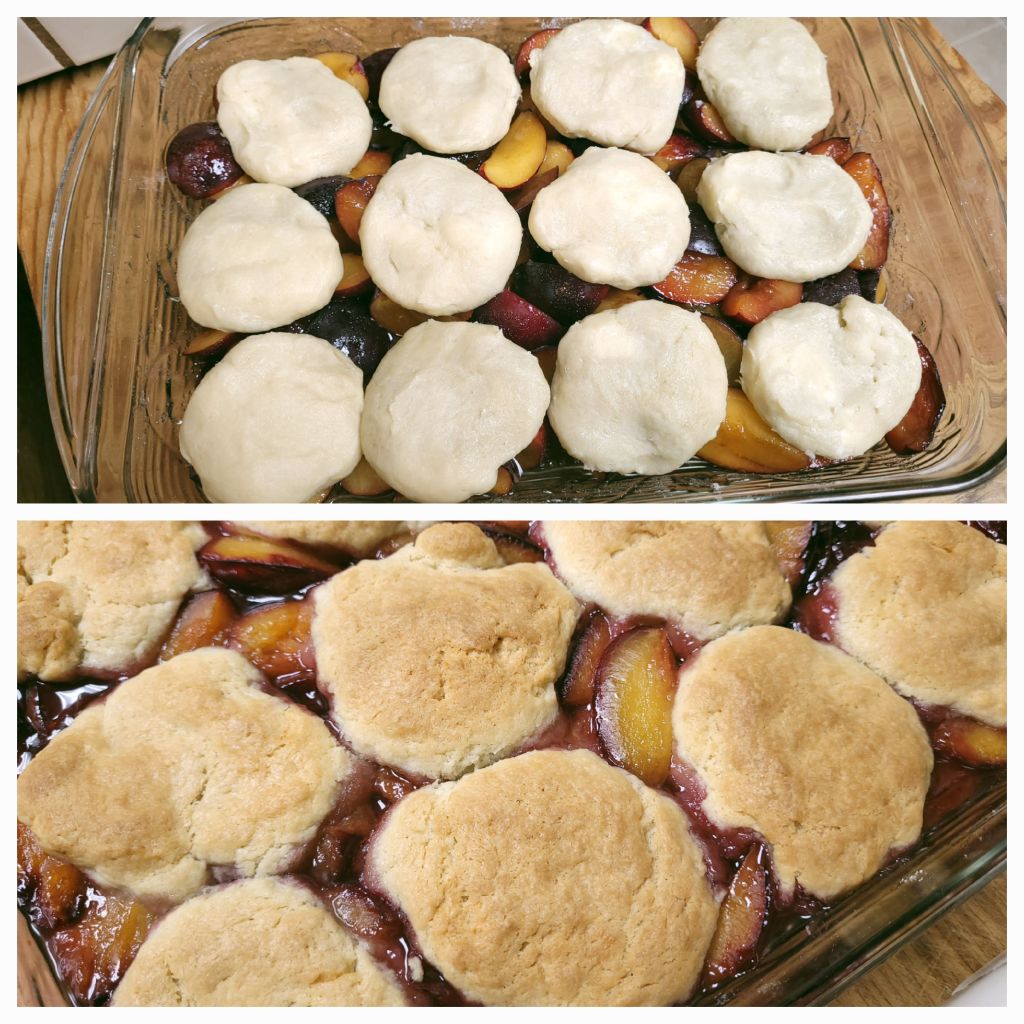 I highly recommend dividing the biscuit dough into either 12 or 15 pieces for this size of dish. Too many more and the biscuits will be too small and will be overcooked before the fruit is done. Too few and the biscuits will be too large and will be burnt on the edges while still undercooked in the middle.