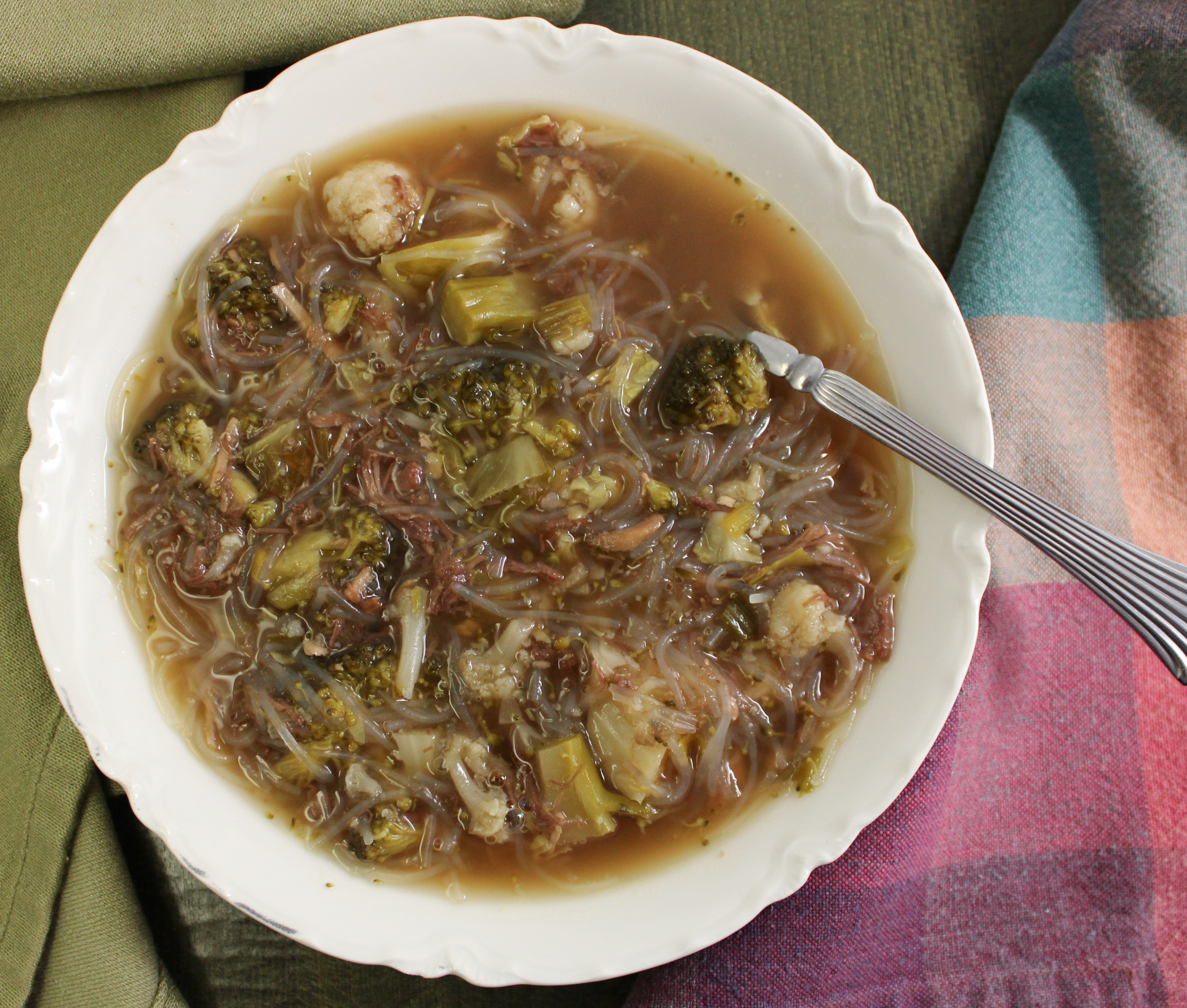 I find it helpful to serve this with both a spoon and a fork to help with eating the noodles. If the noodles absorb too much of the broth, you can add more to thin it as desired. You could also add more noodles if you prefer something thicker, it’s up to you! Enjoy!