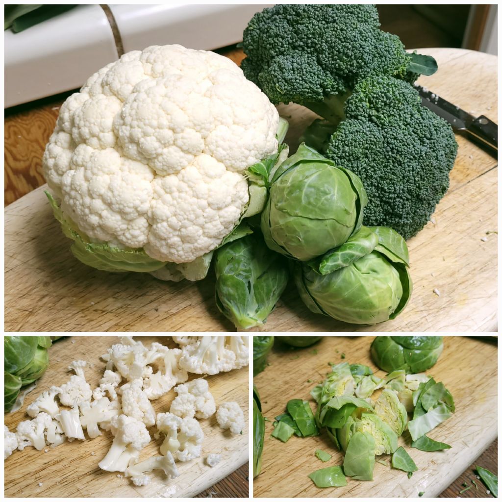 It was those last two dishes I mentioned that became the inspiration for this soup. As I tend to do, I had purchased an overabundance of my favorite brassicas- broccoli, Brussels sprouts, and cauliflower– and they were languishing in the refrigerator. I had been telling myself for far too long that they needed to be used up and not just go straight to the compost pile. It just so happened that I also had an even more neglected chunk of fresh ginger root sitting in there, too. What a happy coincidence!