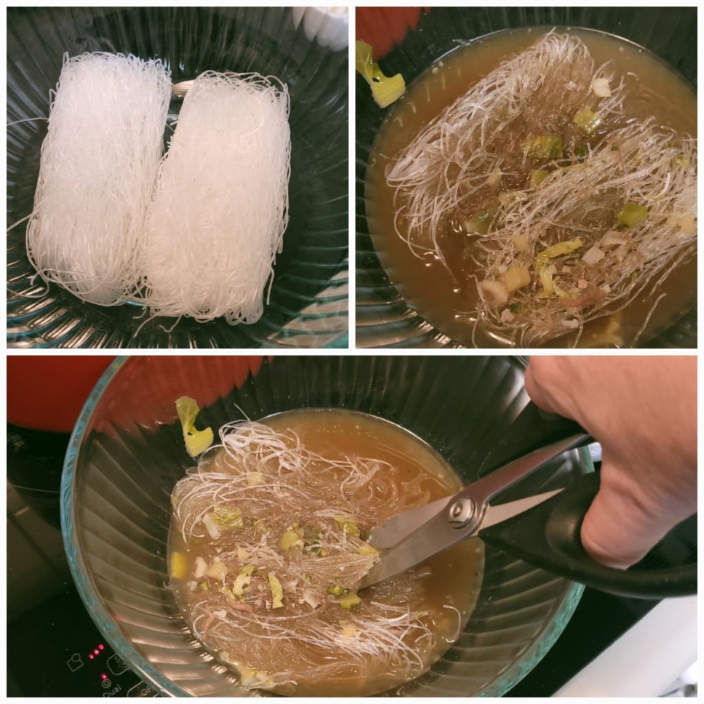 Mung bean noodles are not brittle in the same way as other pasta noodles are, so it is almost impossible to break it up into smaller pieces prior to being cooked. I like to break it up to make it easier to serve because otherwise you will be pulling out a massive wad of noodles all at once. All it takes is a quick soak in the hot broth and a pair of clean kitchen scissors to take care of that problem. I do this in a separate bowl, then add them to the soup for the final cooking.