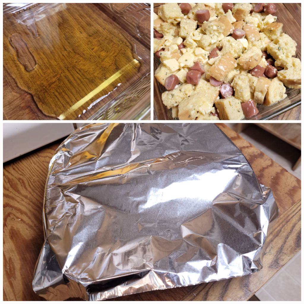 Preheat the oven to 400 F. Lightly oil an oven safe dish large enough to hold the amount of ingredients you are preparing. Be sure to choose a more shallow pan vs one that is deep.