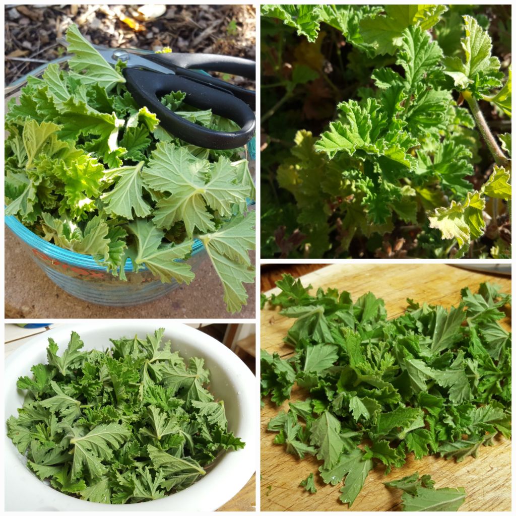 The best time of day to harvest scented geranium leaves is in the early morning and after having been recently watered. Many of the compounds that provide the flavor tend to dissipate throughout the day, especially if it’s warm. Be sure to harvest from plants that are not being sprayed with any kind of pesticides, or ones that animals may have regularly urinated or defecated on.